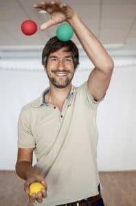 Seit 2006 Diplom Sportökonom und aktiv im Betrieblichen Gesundheitsmanagement; 3 Jonglierbälle; 5000 Dominosteine; Lego Serious Play, Life Kinetik, Pfeil und Bogen und viele weitere Tools, um Workshops kreativ zu gestalten.
